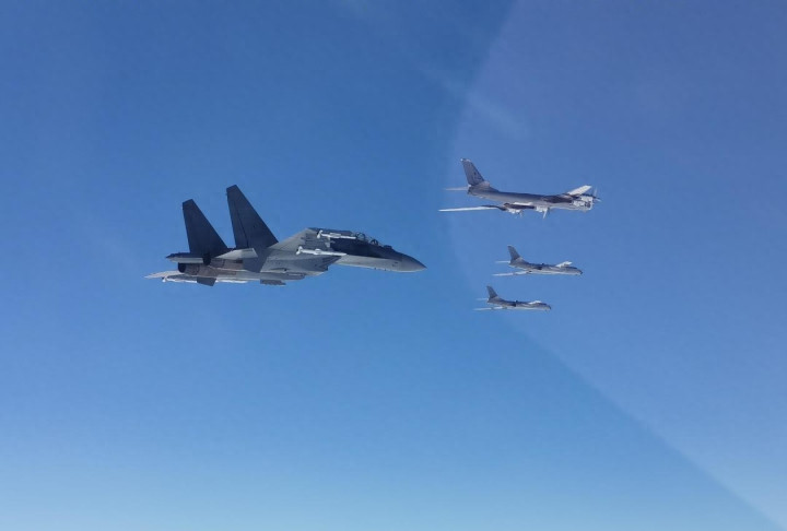 乍一看,这阵容挺唬人,又是战斗机又是战略轰炸机的,似乎是要给中俄一点颜色看看。